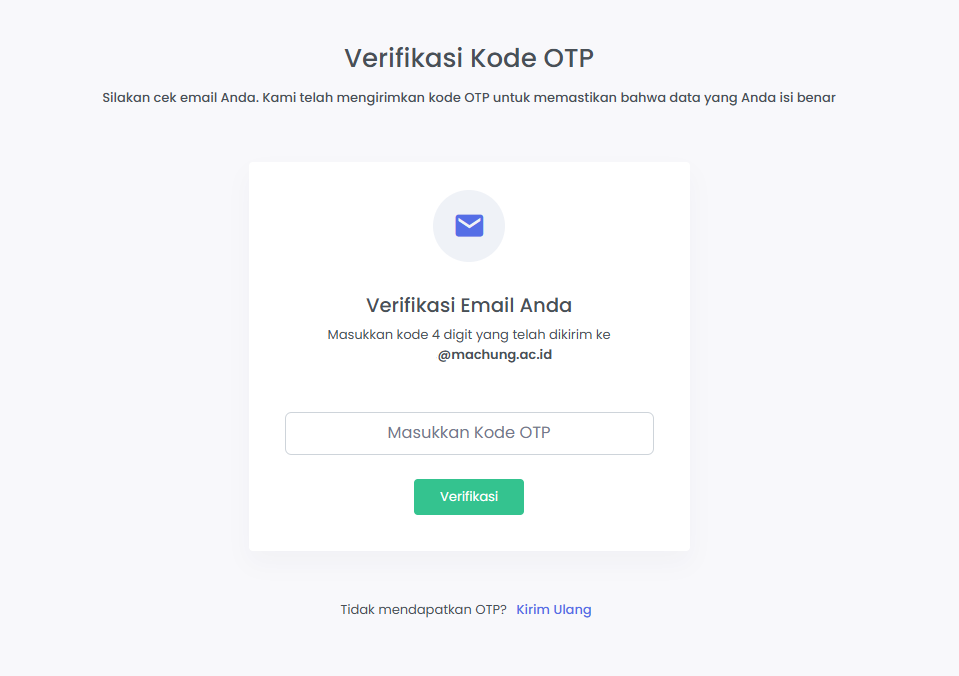 Alumni dapat mengisikan kode OTP yang dikirim dari email [email protected]. Apabila email tidak masuk pada Inbox/Kotak masuk, maka dapat memeriksa Spam/Junk Email. Setelah mendapatkan kode OTP dari email, maka Alumni dapat mengisikan form OTP sesuai OTP yang dikirimkan melalui email. Jika sudah berhasil mengisikan kode OTP, maka dapat memilih tombol Verifikasi.