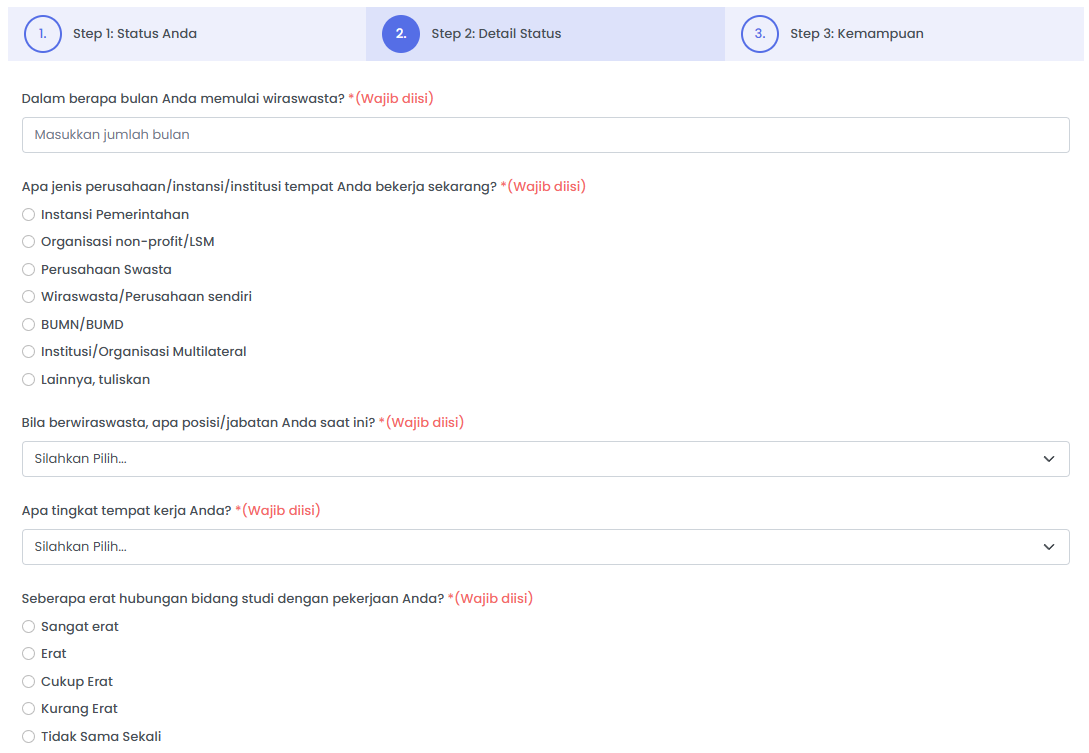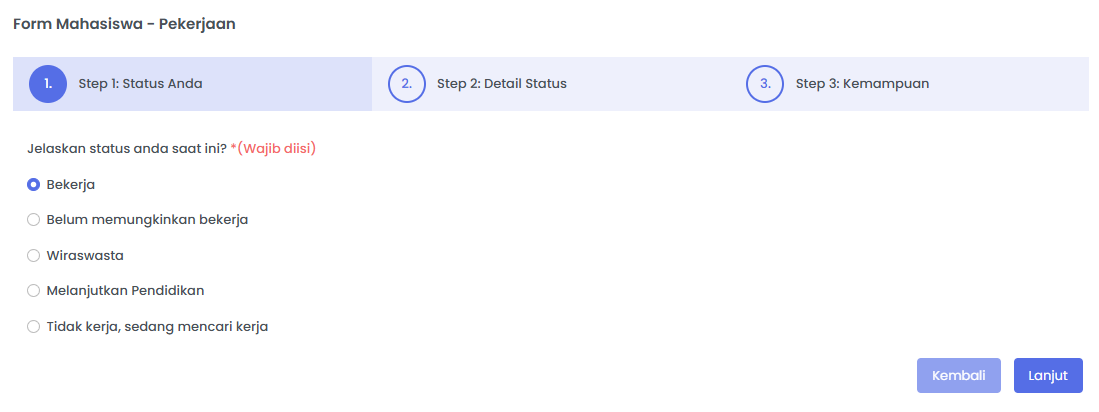 Untuk tahap pertama, sistem menampilkan pilihan status Alumni saat ini yang terdiri dari: