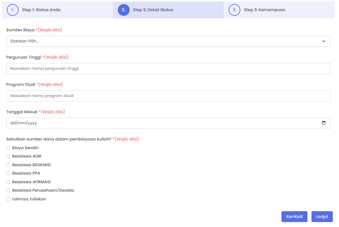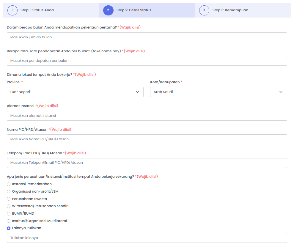 Contoh untuk daftar pertanyaan jika memilih status melanjutkan pendidikan