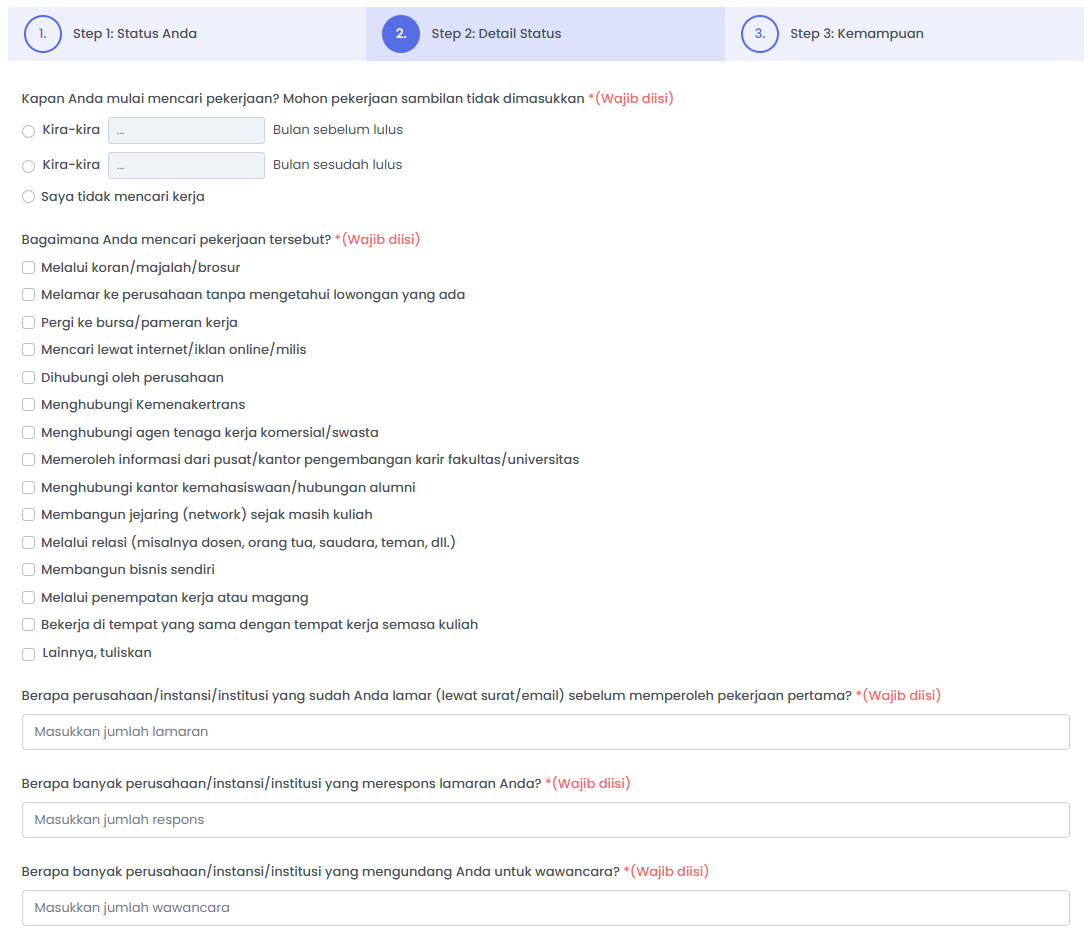 *)Sebagai informasi tambahan, daftar pertanyaan akan berbeda setiap status. Oleh karena itu, Alumni dapat memilih sesuai kondisi saat ini.