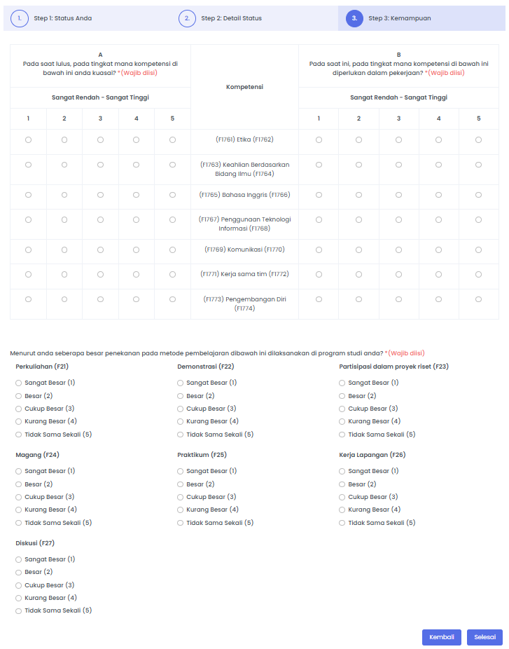 Jika sudah selesai mengisikan tahap kedua sesuai status Alumni saat ini, maka dapat melanjutkan ke tahap terakhir yaitu tentang kemampuan. Pada tahap ini, daftar pertanyaan untuk semua status Alumni tidak ada perbedaan. Untuk menyelesaikan pengisian angket Tracer Study, maka dapat memilih tombol Selesai.
